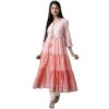 Garnet red winter tiered dress in round neck with rubber printed yoke and gathered sleeves.
